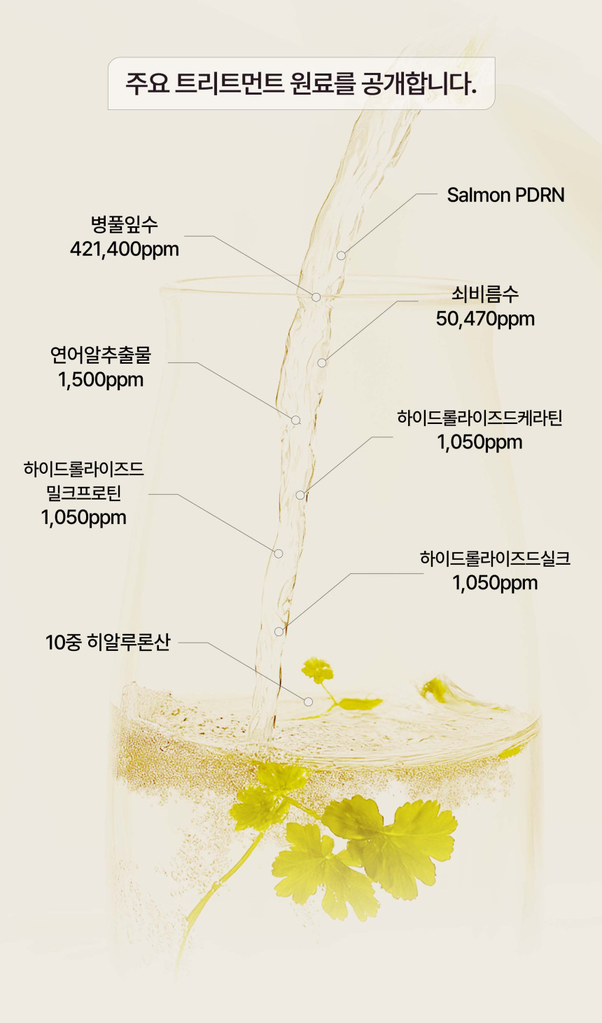 Centella Asiatica Leaf Water(421,400ppm), Water(Aqua), Cetearyl Alcohol, Propylene Glycol, Portulaca Oleracea Water(50,470ppm), Glycerin, Behentrimonium Chloride, Steartrimonium Chloride, Brassicamidopropyl Dimethylamine, Cetyl Alcohol, 1,2-Hexanediol, Fragrance(Parfum), Isoamyl Laurate, Cetrimonium Chloride, Dimer Dilinoleyl Dimer Dilinoleate, Polyquaternium-10, Polyquaternium-67, Caprylyl Glycol, Behentrimonium Methosulfate, Ethylhexylglycerin, Panthenol(2,000ppm), Salmon Egg Extract(1,500ppm), Butylene Glycol, Hydrolyzed Keratin(1,050Ppm), Hydrolyzed Milk Protein(1,050ppm), Hydrolyzed Silk(1,050ppm), Aspartic Acid, Disodium EDTA, Hydroxyacetophenone, Sodium DNA, Sodium Hyaluronate, Hyaluronic Acid, Hydrolyzed Hyaluronic Acid, Hydrolyzed Sodium Hyaluronate, Hydroxypropyltrimonium Hyaluronate, Potassium Hyaluronate, Sodium Hyaluronate, Crosspolymer, Pentylene Glycol, Sodium Acetylated Hyaluronate
