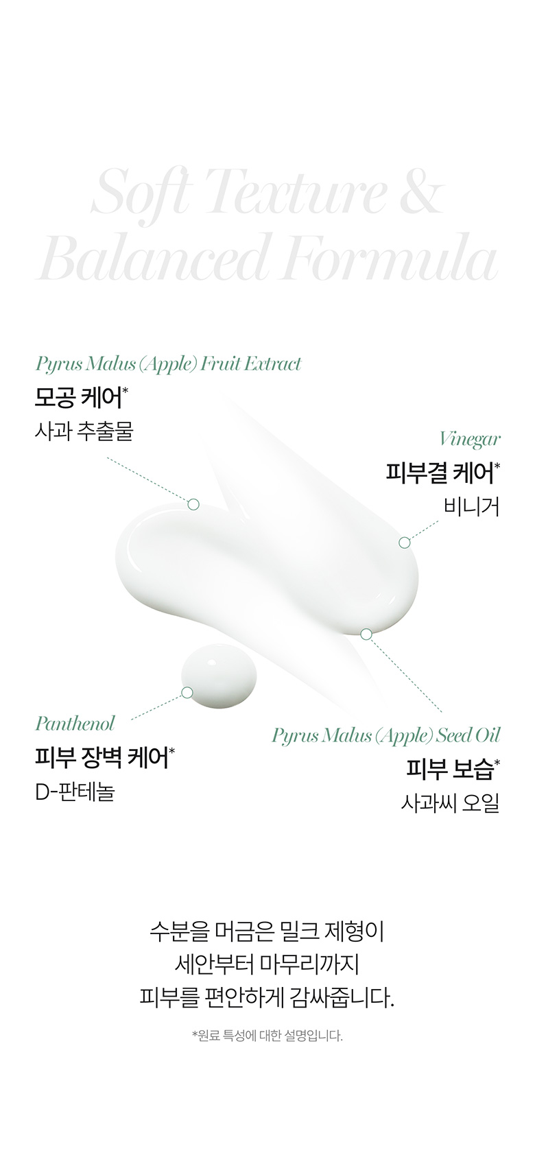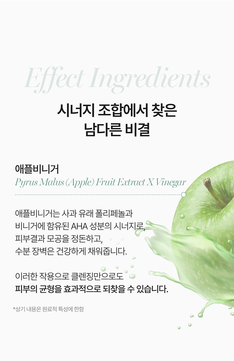 - Refines Skin Texture & Pores: Apple vinegar, rich in apple-derived polyphenols and natural AHA components, gently helps to refine skin texture and tighten pores.