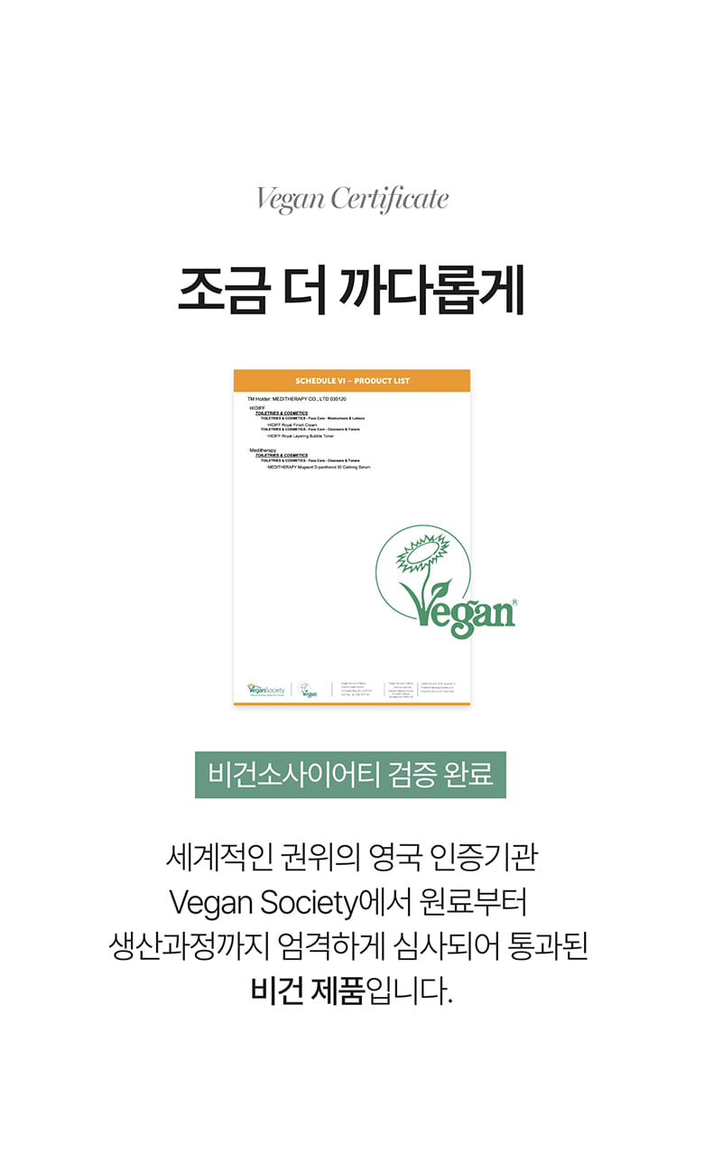 We go a step further with our commitment to ethical and sustainable beauty. The HIDIFF Royal Layering Bubble Toner has successfully completed verification by the globally respected UK certification body, The Vegan Society.