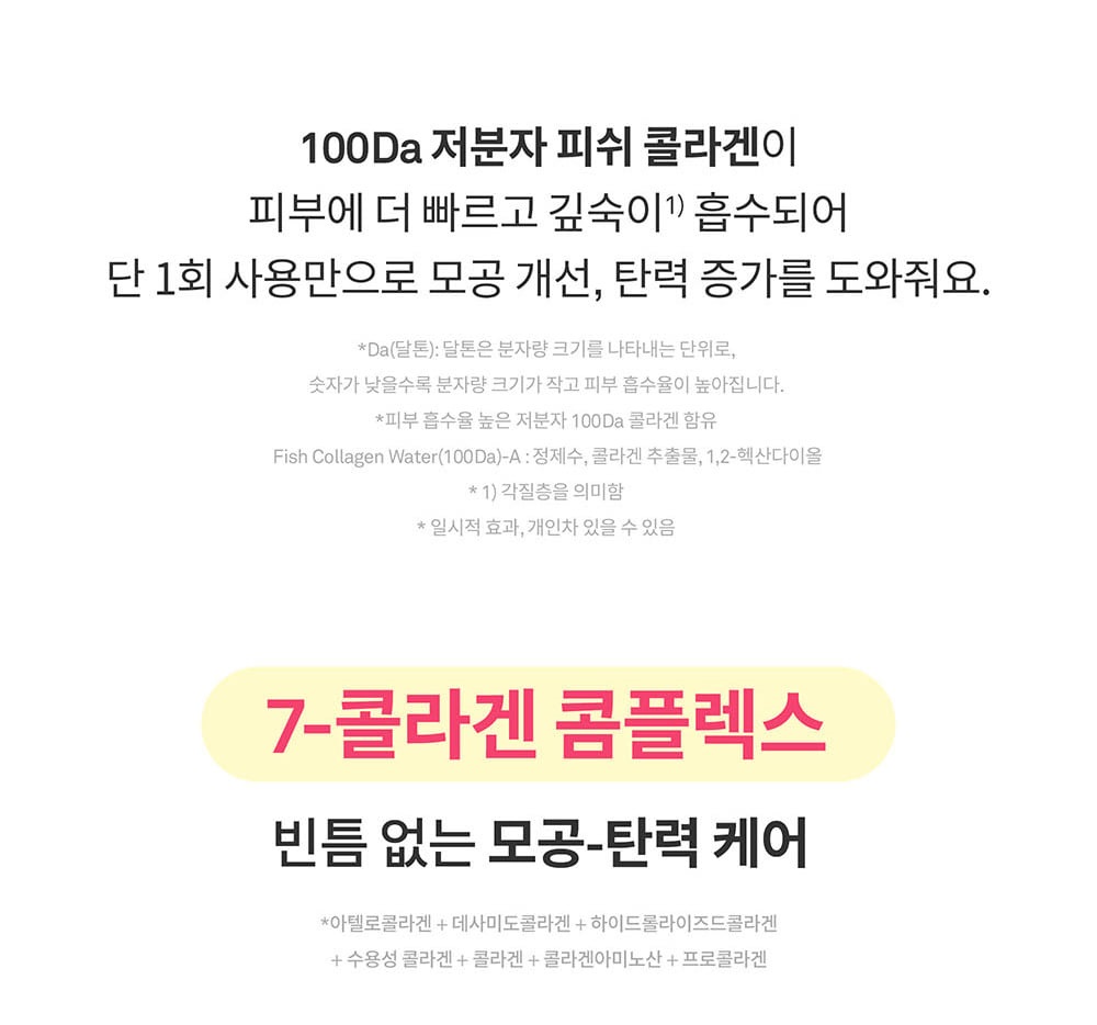- 100 Da Low Molecular Collagen: Featuring ultra-small 100 Dalton (Da) collagen molecules, this mask ensures superior absorption into the skin, promoting enhanced elasticity and firmness from within.