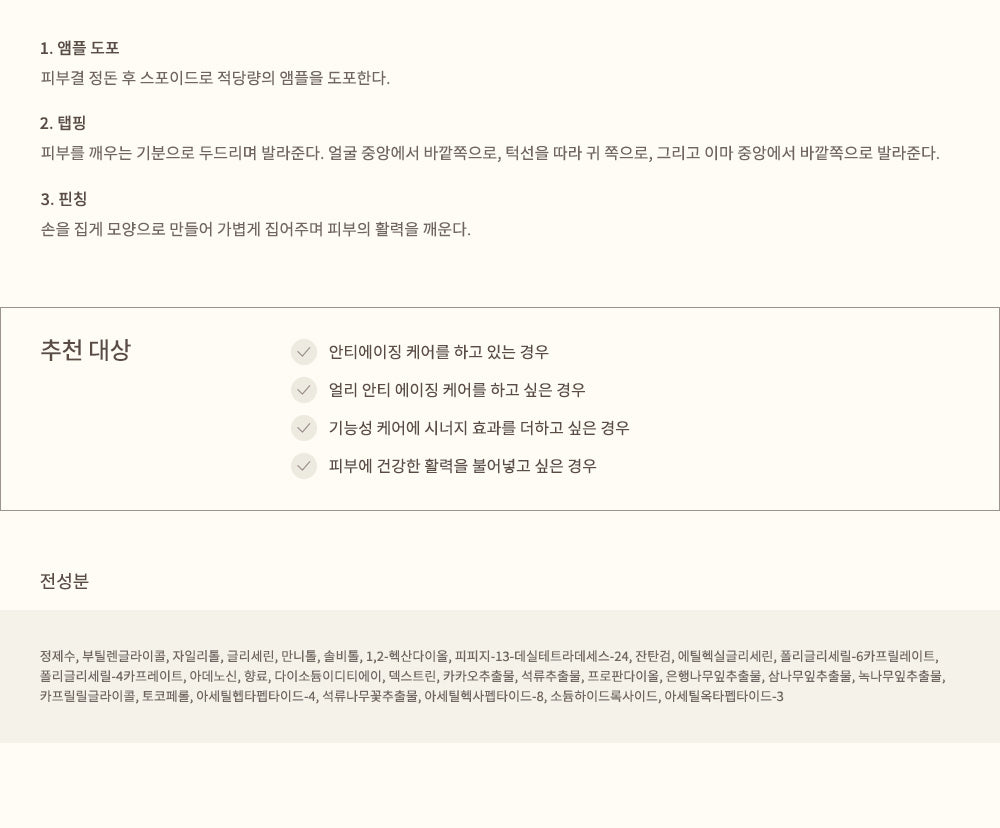 Water, Butylene Glycol, Xylitol, Glycerin, Mannitol, Sorbitol, 1,2-Hexanediol, PPG-13-Decyltetradeceth-24, Xanthan Gum, Ethylhexylglycerin, Polyglyceryl-6 Caprylate, Polyglyceryl-4 Caprate, Adenosine, Fragrance, Disodium EDTA, Dextrin, Cacao Extract, Pomegranate Extract, Propanediol, Ginkgo Biloba Leaf Extract, Cedar Leaf Extract, Camphor Leaf Extract, Caprylyl Glycol, Tocopherol, Acetyl Heptapeptide-4, Pomegranate Flower Extract, Acetyl Hexapeptide-8, Sodium Hydroxide, Acetyl Octapeptide-3.