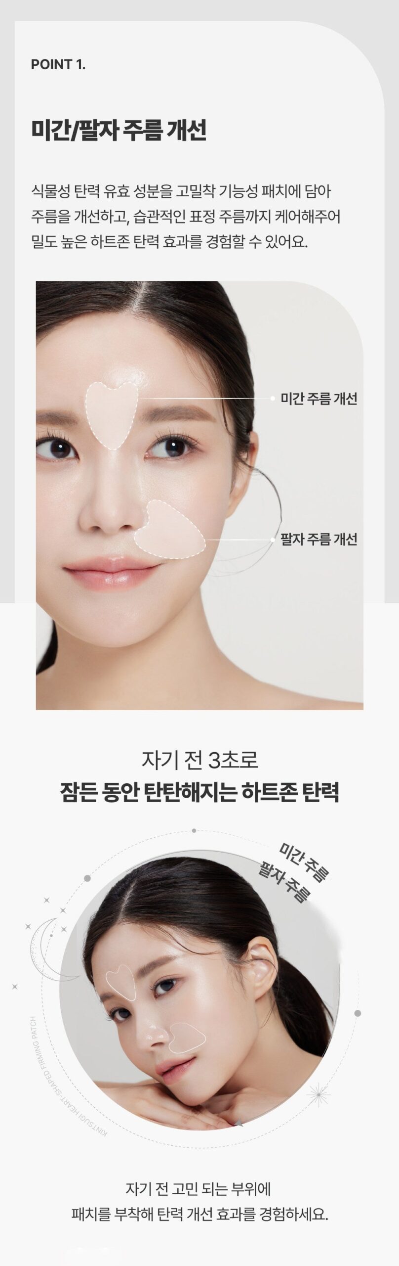 Improve wrinkles between the eyebrows and nasolabial folds with plant-based elasticity active ingredients. Achieve firmer heart zone elasticity while you sleep by simply applying the patch three seconds before bed.