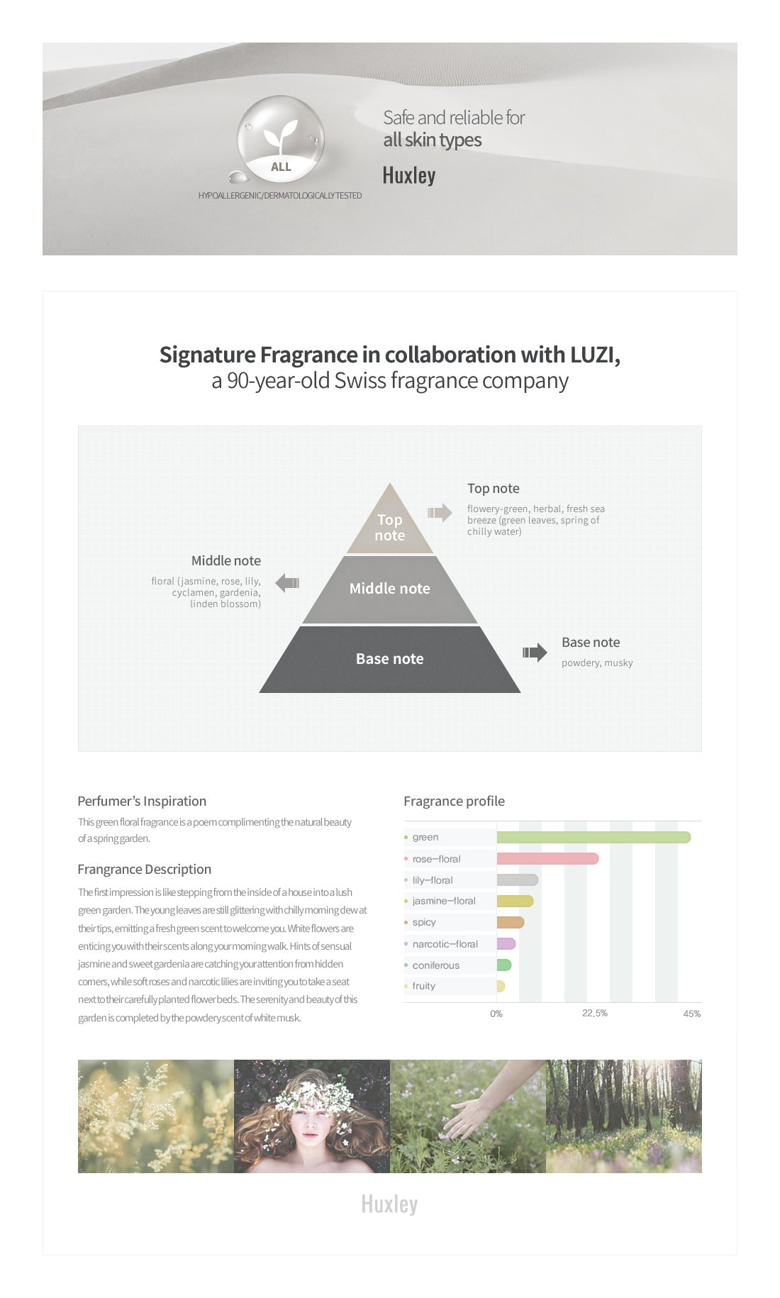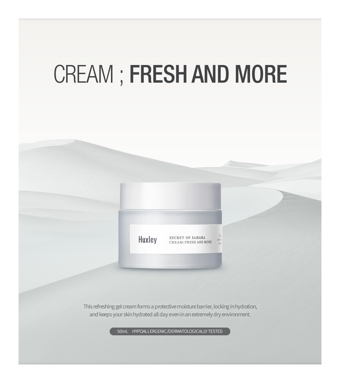 – HUXLEY Cream Fresh and More is a light, refreshing gel cream that creates a barrier that locks in moisture for all day hydration even in extreme dry environments.