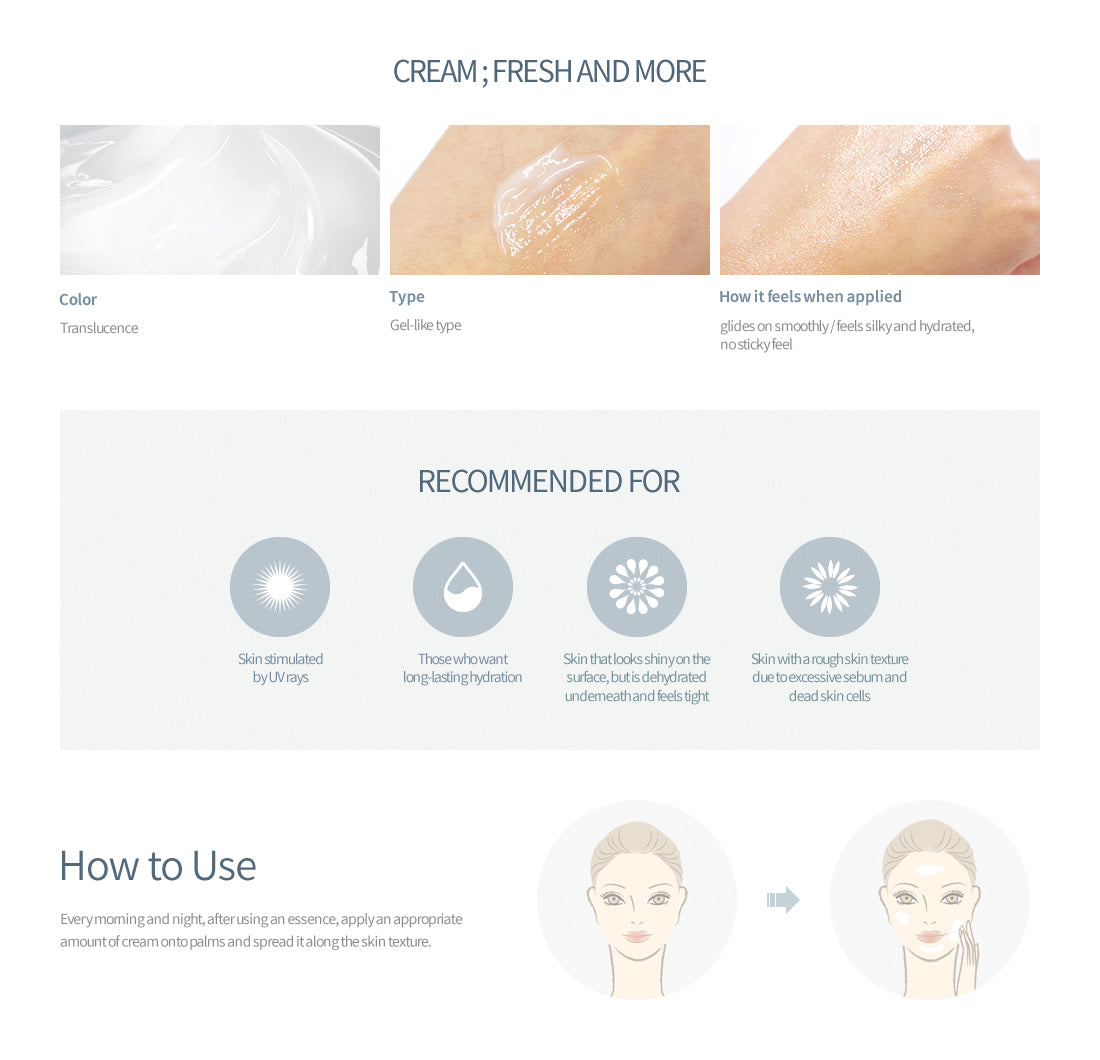 Every morning and night, after using essence, take a proper amount of cream and rub a little between your palms to melt. Gently press into the skin with your hands until absorbed.
