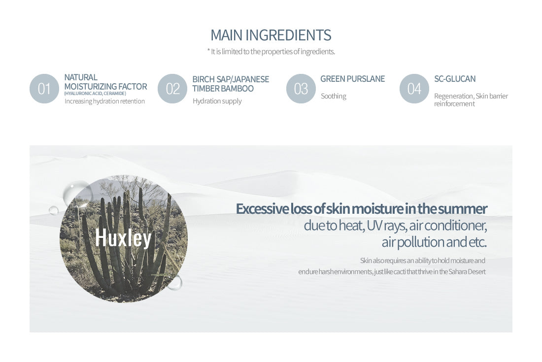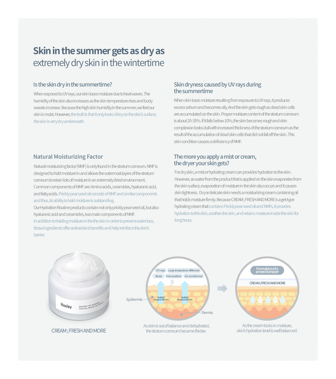 – HUXLEY Cream Fresh and More is a light, refreshing gel cream that creates a barrier that locks in moisture for all day hydration even in extreme dry environments.