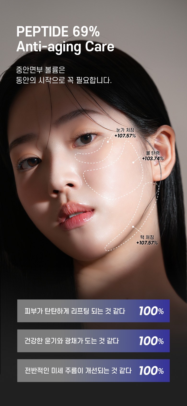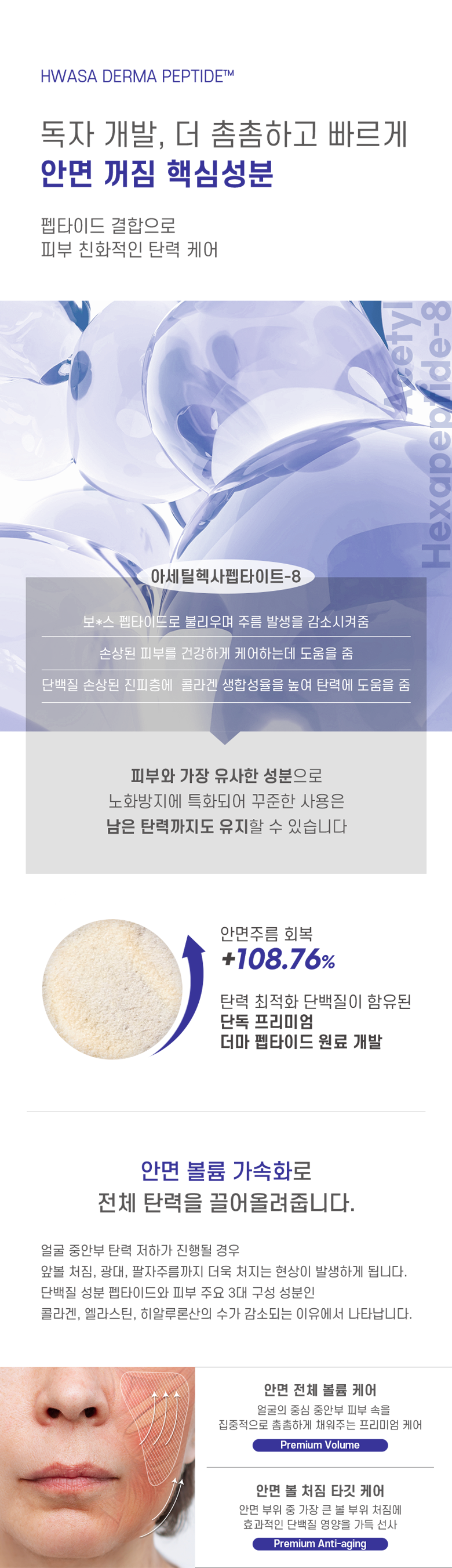 Hwasa Derma Peptide 69% Lifting Firming Care Cream is an advanced anti-aging cream formulated with a high concentration of peptides (69%) to visibly lift and firm sagging skin. This innovative formula targets facial contour concerns, particularly around the cheeks and jawline, while providing intensive wrinkle care. The light sherbet cream texture absorbs quickly without stickiness, leaving skin hydrated and elastic all day.
