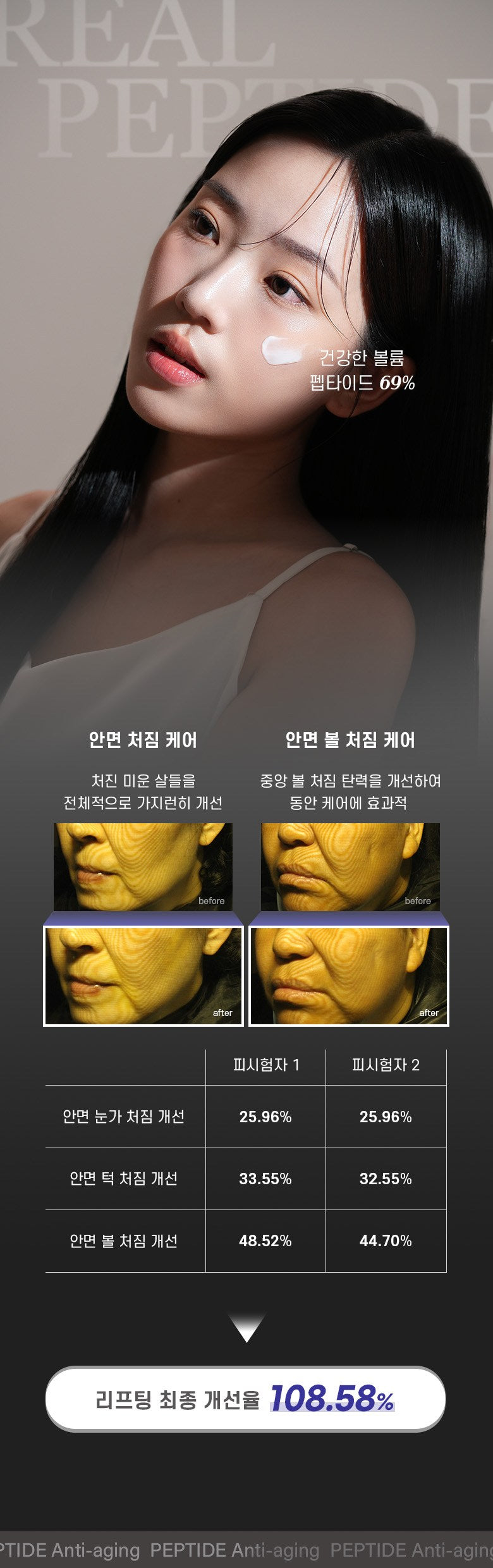 Experience a revolutionary facial lifting solution with DERMA REAL PEPTIDE, packed with 690,000ppm of peptides and 69% protein. This powerful formula enhances facial elasticity and delivers a noticeable lifting effect.