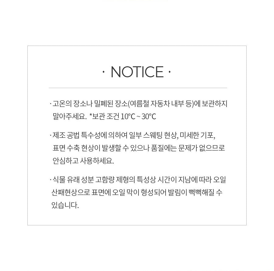 - Due to the natural formulation, slight oil separation, bubbles, or surface contraction may occur without affecting product quality.