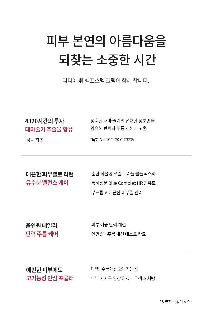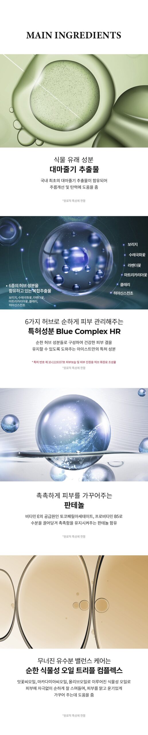 A soothing blend of six herb extracts—borage, cornflower, lavender, matricaria, clary, and hyacinth—to hydrate and calm sensitive skin. (Patent No. 10-1119337)