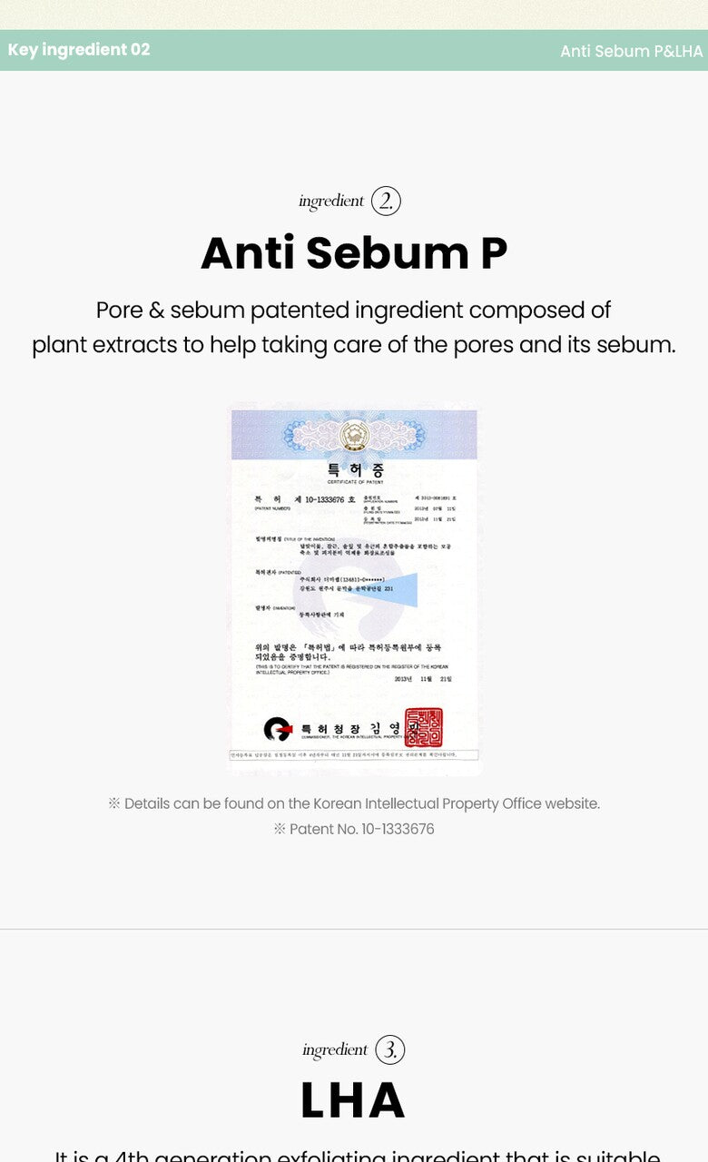 It used ANTI SEBUM P which is a patented sebum ingredient, sesame oil, and LHA to manage pores and blackheads.