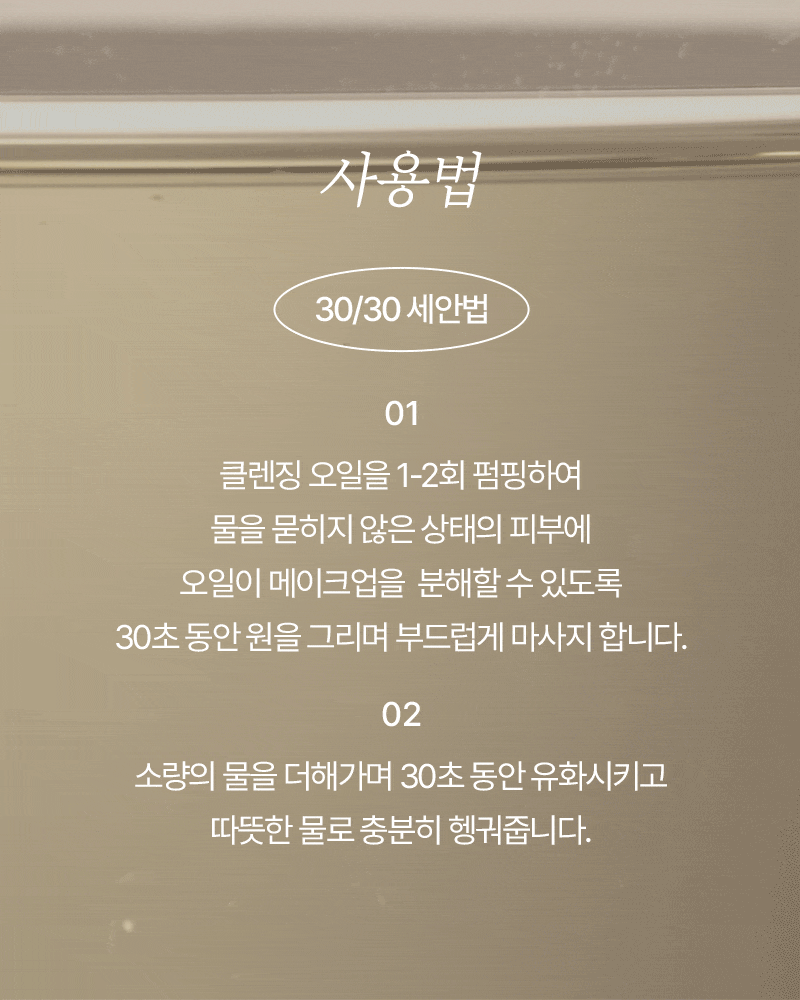 01. Pump cleansing oil 1-2 times and gently massage in a circular motion on dry skin for 30 seconds to help the oil break down makeup.