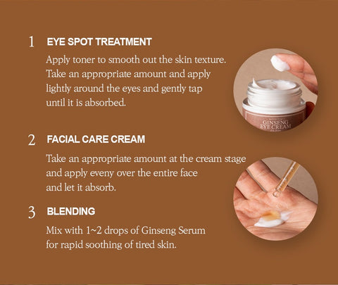 This eye cream contains three types of rare ginseng from Geumsan – panax ginseng, red ginseng and wood-cultivated ginseng to provide nutrition to the tired eyes (eyes area) and create a smooth and firm face line. Containing the 3.65% of purest concentrated essence of 6-year-old ginseng, it is extremely effective for wrinkle management. Its dense, firm texture being adhered tightly to your skin while helps to locks in moisture and make your skin looks healthy. Also, the bittersweet fragrance of red ginseng provides your skin with deep relaxation.