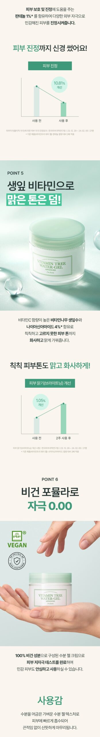 This water-gel moisturizer offers a refreshing, lightweight hydration experience. Infused with the power of vitamin tree leaf extract, it provides immediate cooling, hydration, and soothing effects for your skin.