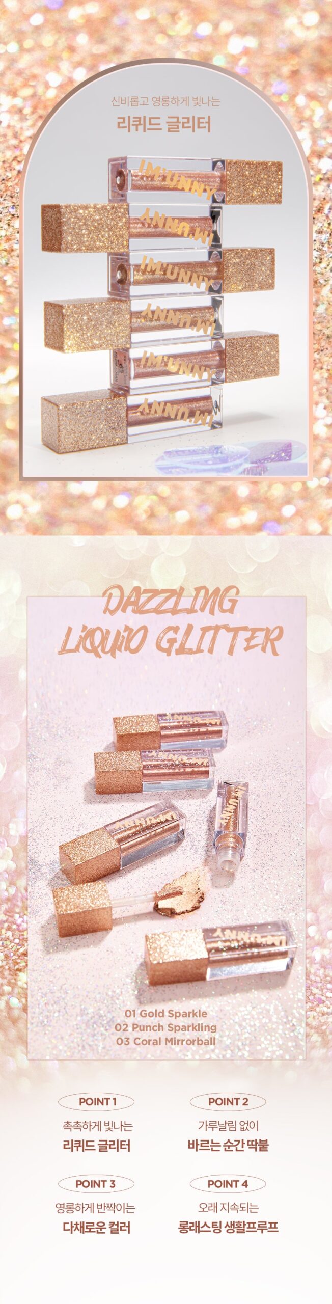 - Moisture-Rich: A liquid-type glitter that keeps the skin glowing and hydrated.