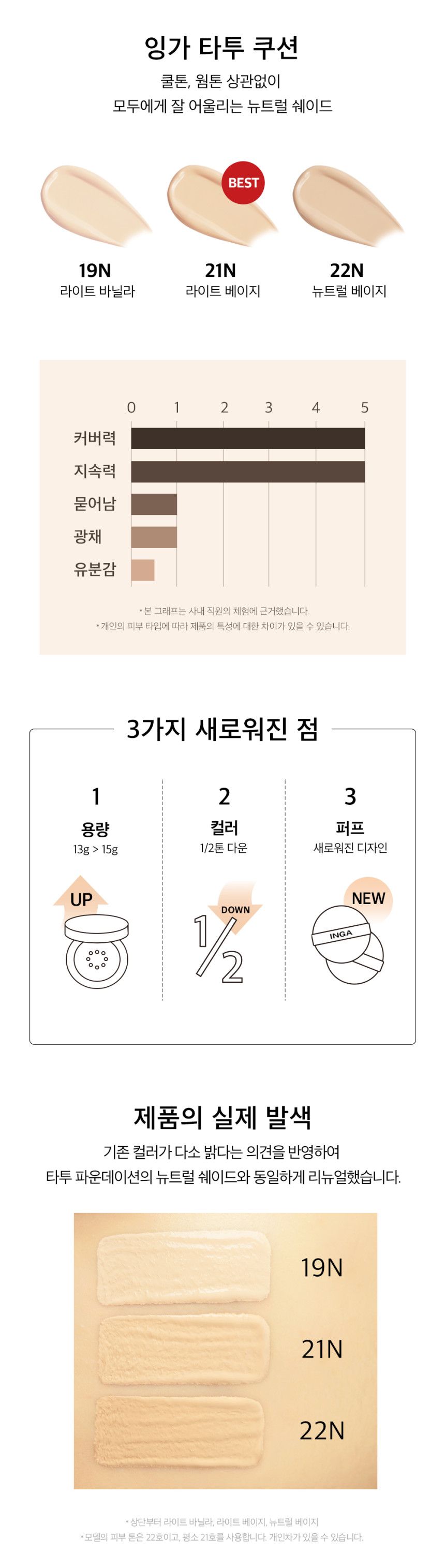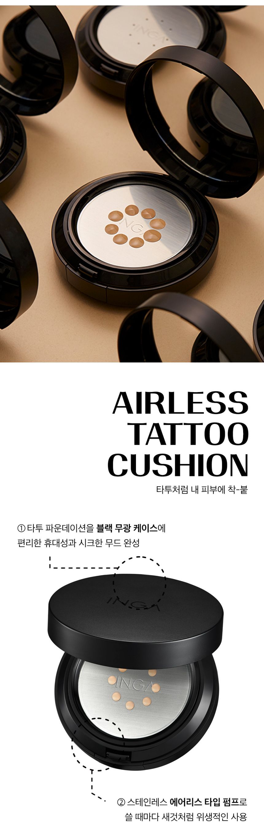 - INGA TATTOO CUSHION : A cushion with high adhesion, high coverage, and long lasting power. It expresses smooth skin without stickiness. Semi-Matte type, but not dry!