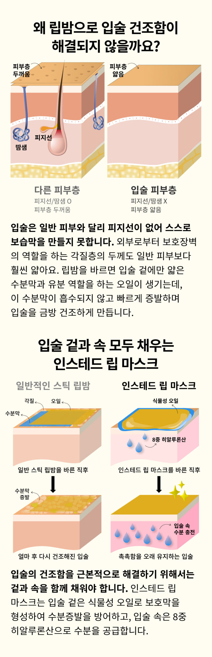 Unlike regular skin, lips have no sebaceous glands and cannot form their own moisture barrier. The thin stratum corneum makes them even more prone to dryness. While most lip balms only coat the surface, the INSTEAD Hydrating Night Lip Mask goes deeper — addressing dryness both inside and outside the lips.