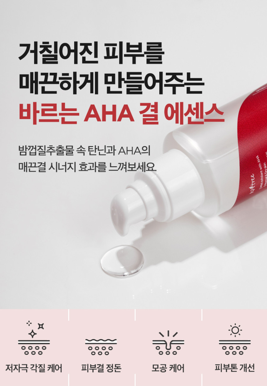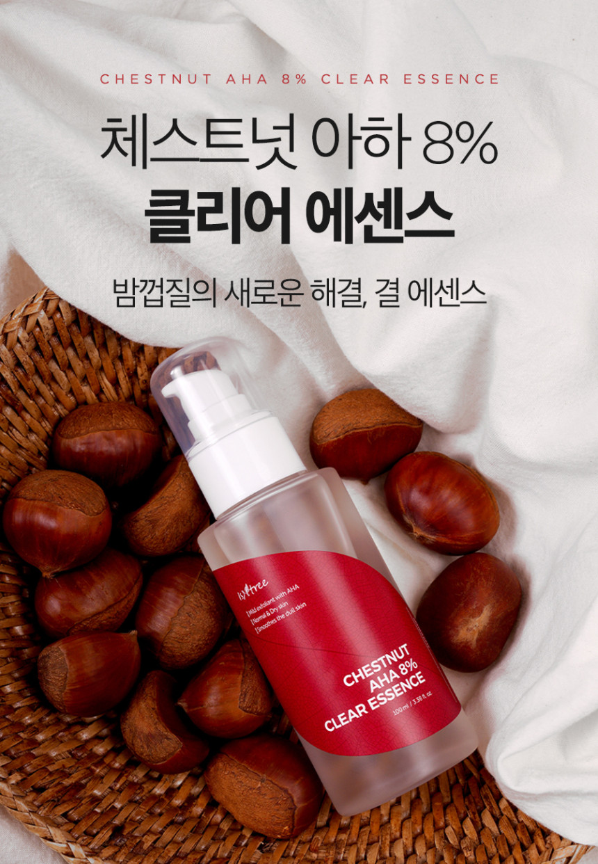 The ISNTREE Chestnut AHA 8% Clear Essence is an exfoliating essence containing 8% AHA and Chestnut Extract to exfoliate dead skin cells for a smoother and brighter complexion. Glycolic acid has the smallest molecular size of any AHA, so it works the most effectively, as it can penetrate deeper and quickly into the skin. Working together with lactic acid, which is more gentle and has hydrating benefits, this combo makes the ultimate AHA duo for clearer skin. Centella asiatica extract and hyaluronic acid are also present to help soothe and calm sensitive skin.