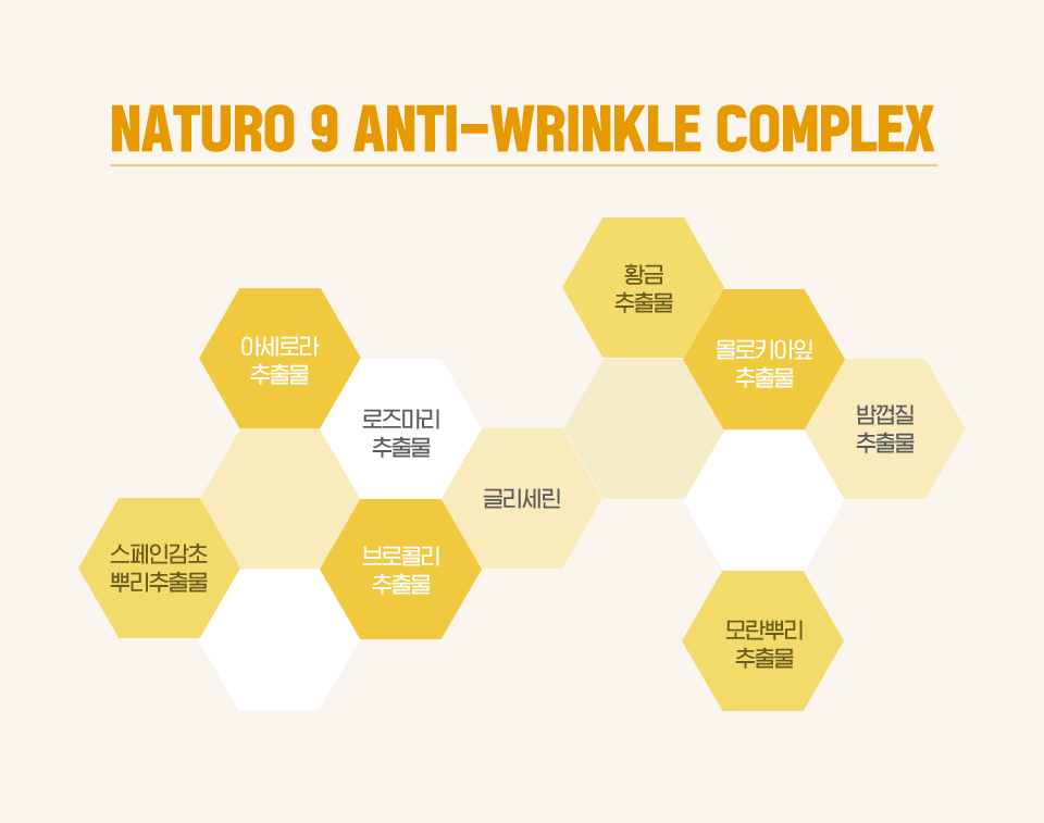 From wrinkle improvement functional ingredient adenosine, elastic peptide ingredient SYN-COLL to 9 plant energy complex Naturo 9 anti-wrinkle complex!