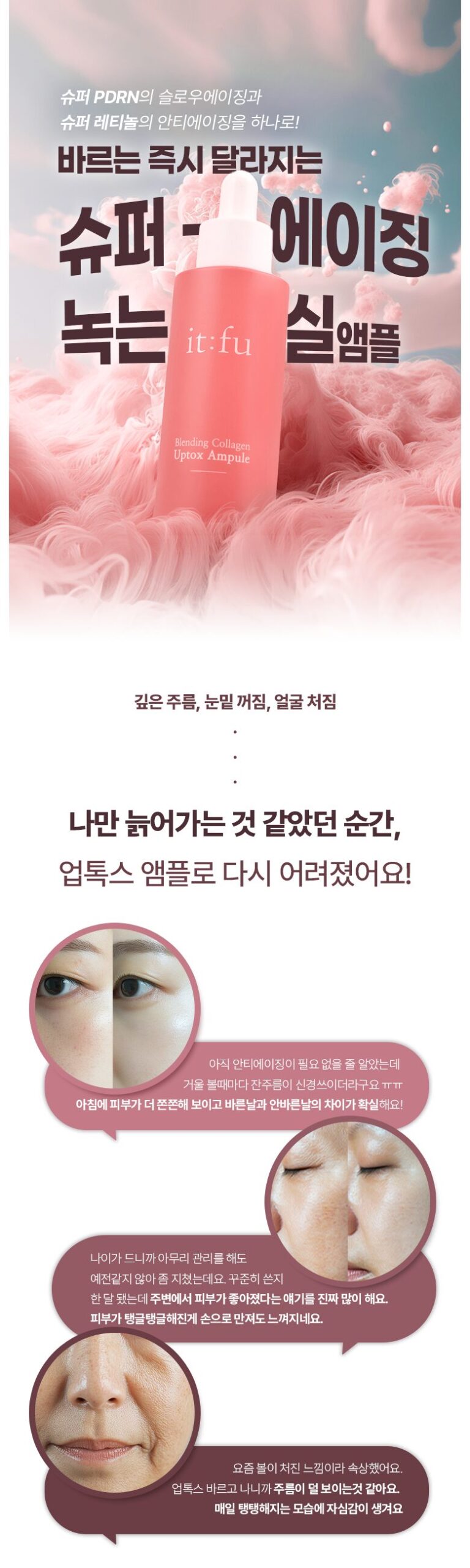 Wow, what a game changer! I’ve been using the it:fu Blending Collagen Uptox Ampoule for about three weeks now, and the transformation is legit. Before, my skin was feeling all dull with those deep wrinkles around my eyes that made me look tired all the time—like seriously stressed mom vibes. But after using this ampoule? My skin feels so revitalized; those pesky lines have softened up like magic! The Super PDRN really got in there to boost elasticity while the Super Retinol smooths things out perfectly. Plus, I love how light and airy it feels when you apply it—a total must-have if you wanna feel young again!