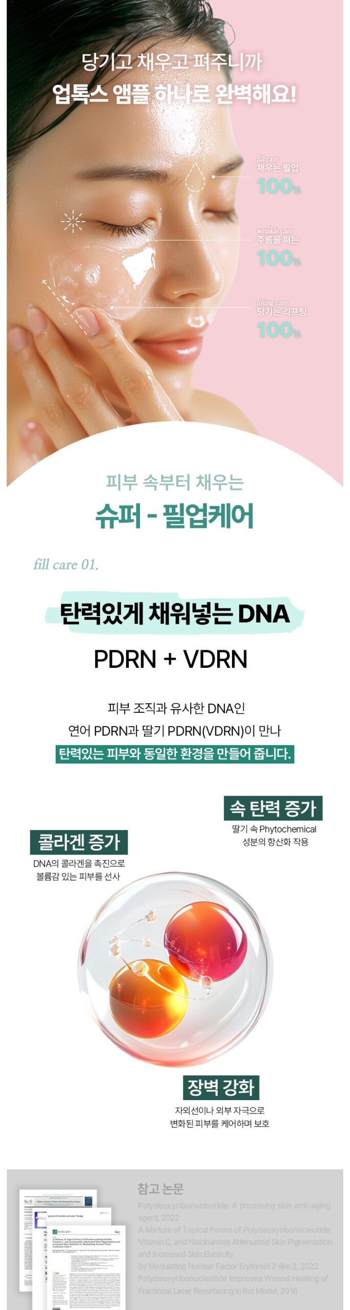 Achieve a firm, elastic complexion with PDRN and VDRN, including salmon and strawberry-derived PDRN, which mimic skin tissue for a natural, plump look.