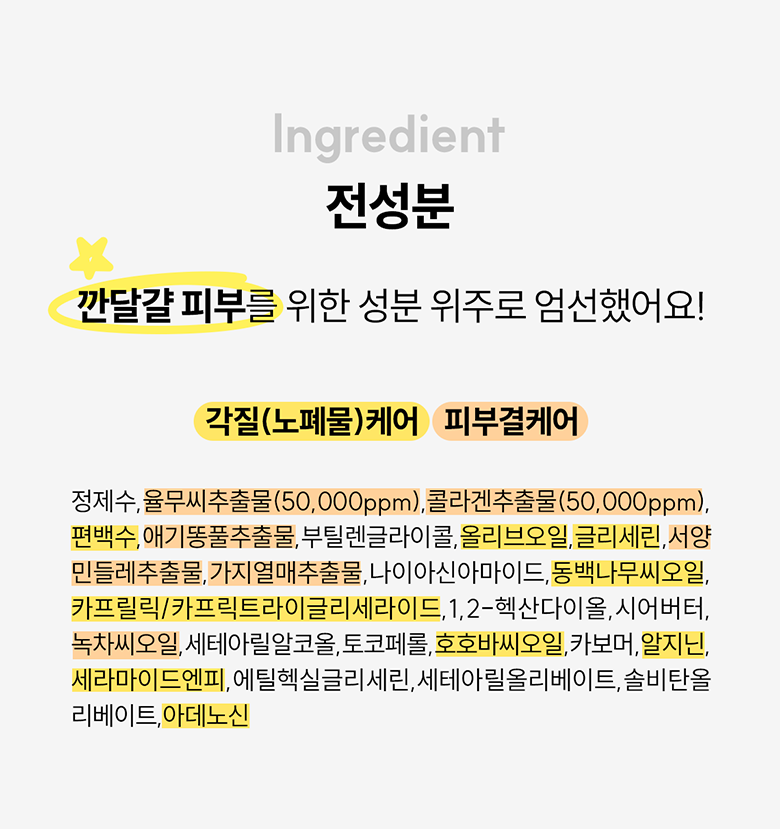 - Yulmu Seed Extract: Eliminates excess sebum and accumulated dead cells.