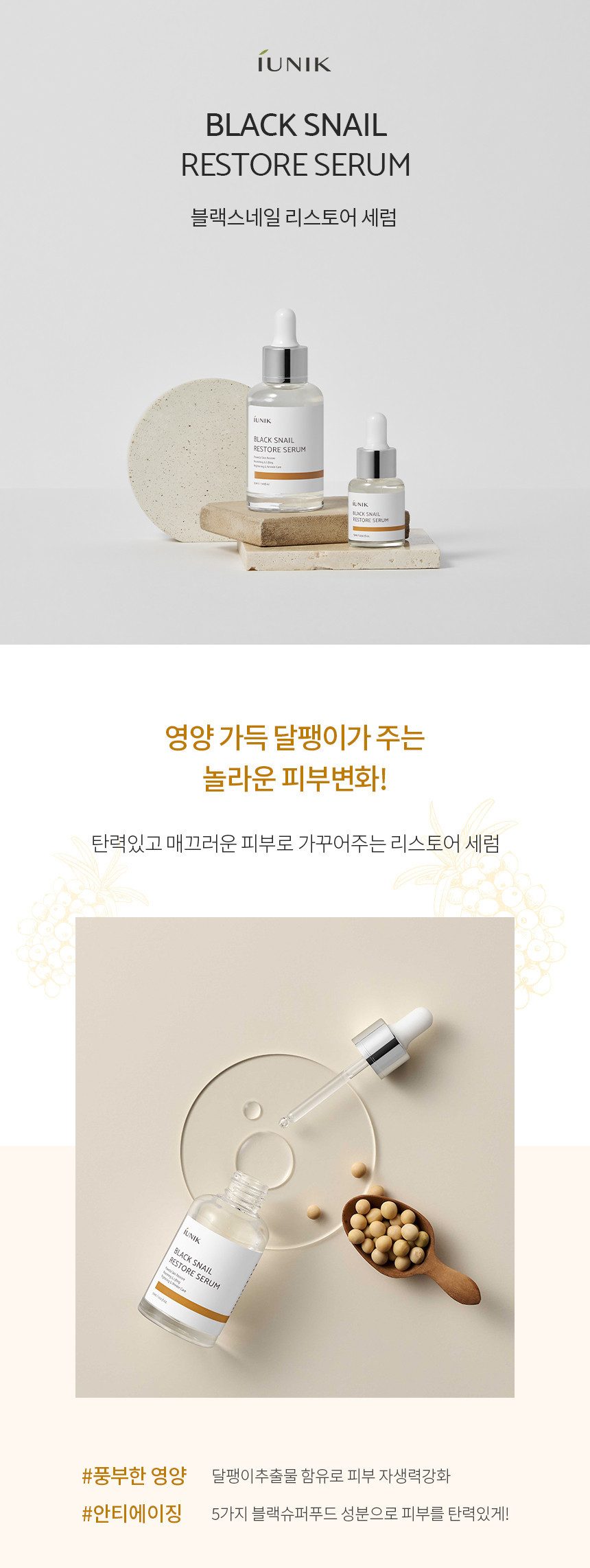 The iUNIK Black Snail Restore Serum is an anti-ageing serum that protects your skin against wrinkles, dull and tired skin. Enriched with 70% black snail extract to nourish and restore supple and smooth skin, centella asiatica to soothe and regenerate, and 5 black super foods (black beans, black sesame, black rice, kelp, eggplants) to infuse the skin with high antioxidant benefits.