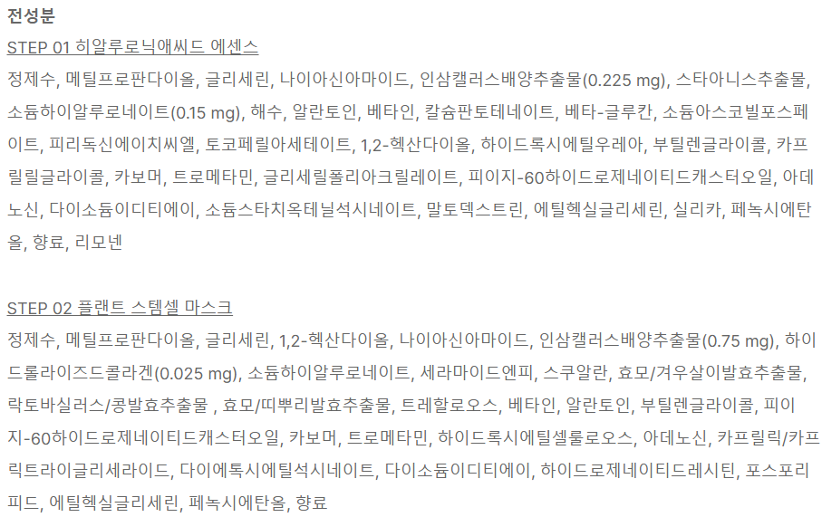Mask: Water, Methylpropanediol, Glycerin, 1,2-Hexanediol, Niacinamide, Panax Ginseng Callus Culture Extract, Hydrolyzed Collagen, Sodium Hyaluronate, Ceramide 3, Squalane, Saccharomyces/Viscum Album (Mistletoe) Ferment Extract, Lactobacillus/Soybean Ferment Extract, Saccharomyces/Imperata Cylindrica Root Ferment Extract, Trehalose, Betaine, Allantoin, Butylene Glycol, PEG-60 Hydrogenated Castor Oil, Carbomer, Tromethamine, Hydroxyethylcellulose, Adenosine, Caprylic/Capric Triglyceride, Diethoxyethyl Succinate, Disodium EDTA, Hydrogenated Lecithin, Phospholipids, Ethylhexylglycerin, Phenoxyethanol, Fragrance