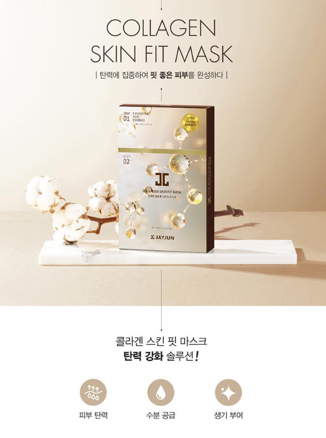 The Jayjun Collagen Skin Fit Mask is a 2-step mask containing a hyaluronic acid essence that helps with the absorption of the mask pack, plus a plant stem cell mask that provides vitality to skin with marine collagen ingredients.