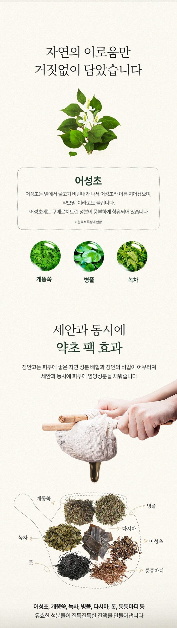 The formula includes a synergy of four botanicals—Houttuynia Cordata, Artemisia, Centella Asiatica, and Green Tea. These ingredients are expertly blended using purified water to ensure the extraction of active, water-soluble compounds, offering a herbal pack effect that nourishes deeply during cleansing.