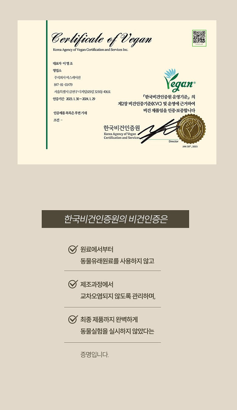 Jeongango has earned vegan certification from the Korea Vegan Certification Association and has been comprehensively tested for various skin benefits, including soothing, moisturizing, and improving skin texture and brightness.