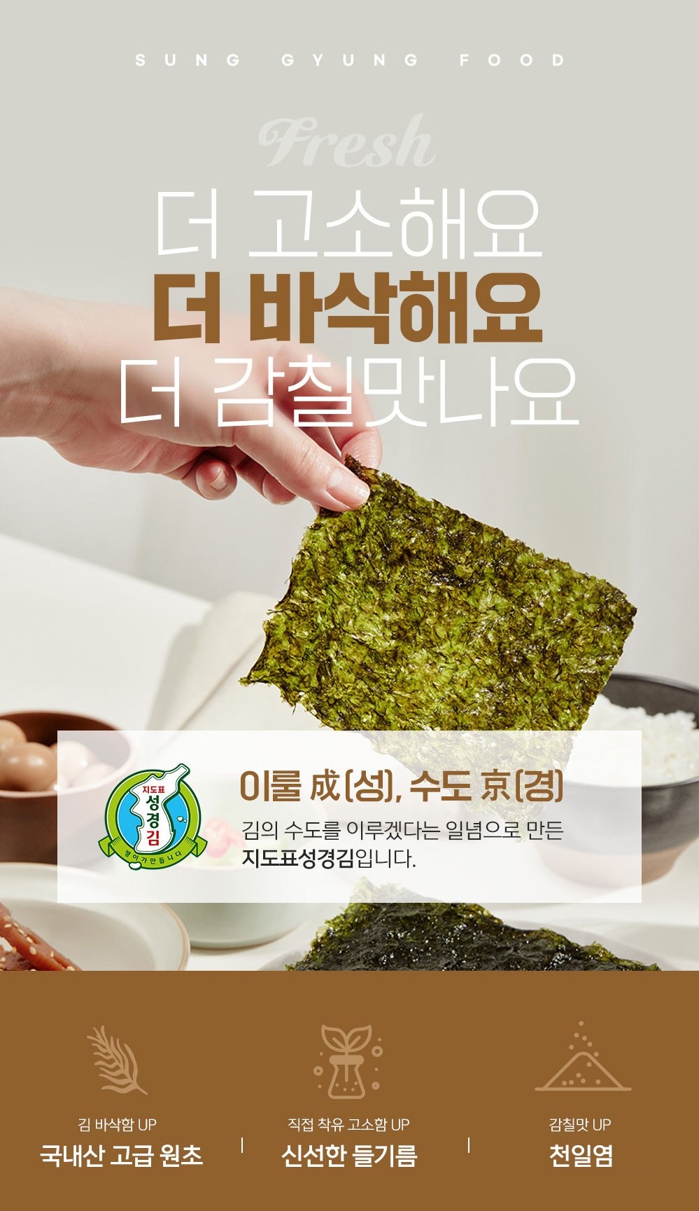 At Sung Gyung Food, we believe in crafting more than just seaweed – we create culinary experiences. Our brand, “Jidopyo Seonggyeong Kim,” proudly translates to “Achieving the Capital of Seaweed,” a testament to our commitment to excellence and becoming the benchmark for premium Korean seaweed.