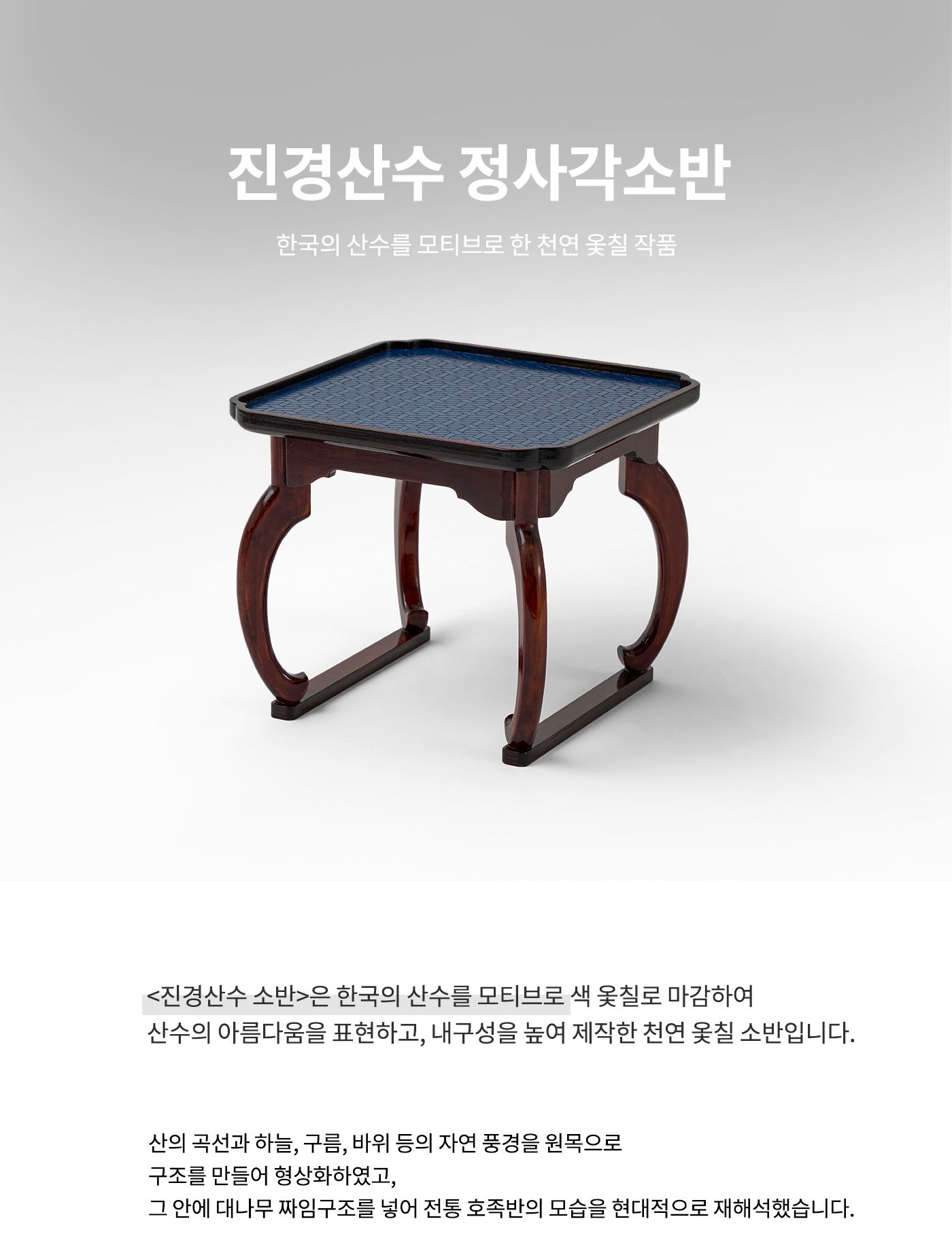 A modern reinterpretation of a traditional square Korean soban (small table) by master artisan Kim Yun-mi. This handcrafted piece beautifully combines traditional Korean ottchil (lacquer) techniques with elegant mountain-water (sansu) curves.
