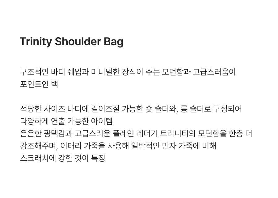 Designed for both style and functionality, the Trinity bag comes with two adjustable straps—a short shoulder strap and a long crossbody strap—allowing for multiple styling options to suit different occasions.