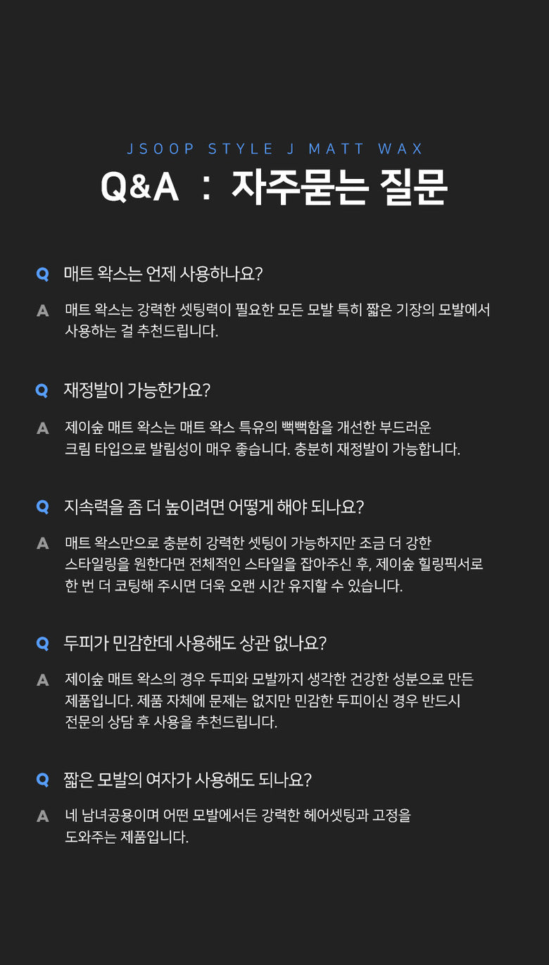 A JSOOP Matte Wax is a product made with healthy ingredients that consider scalp and hair. There is no problem with the product itself, but if you have a sensitive scalp, we recommend using it after consulting a specialist.