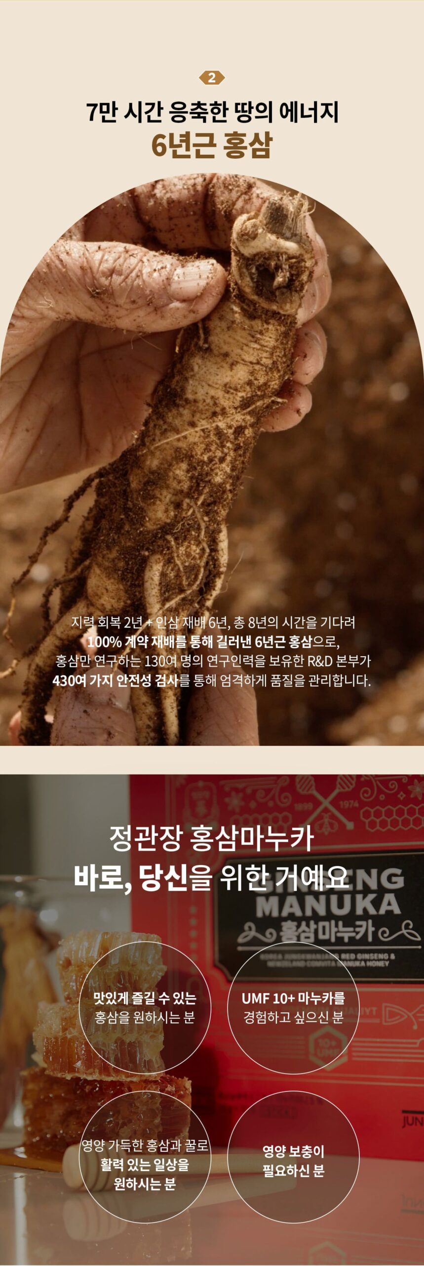 The JUNG KWAN JANG Ginseng Manuka is an impressive blend of 100% Korean 6-year-old red ginseng and UMF10+ Manuka honey. After using it daily, I noticed a significant boost in my energy levels and overall wellness. The quality is evident, as this product undergoes extensive safety testing with over 430 tests conducted by researchers focused on the efficacy of ginseng. The infusion of pure manuka honey adds a pleasant sweetness while providing additional health benefits like improved immunity. It truly feels revitalizing!