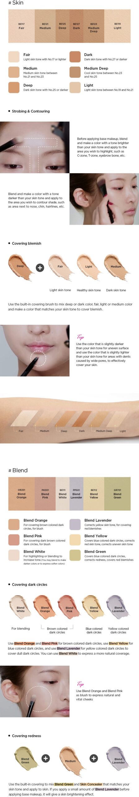 - For redness: Mix Blend Green with a skin-matching concealer and apply. Pre-applying a small amount of Blend Lavender can brighten the skin.