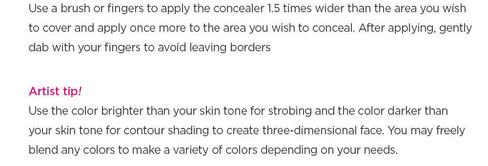 Apply the concealer 1.5 times wider than the target area, adding an extra layer on top for precision coverage. Gently dab with fingers to blend seamlessly.