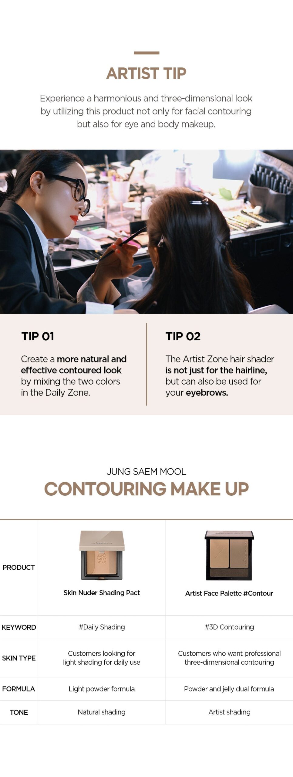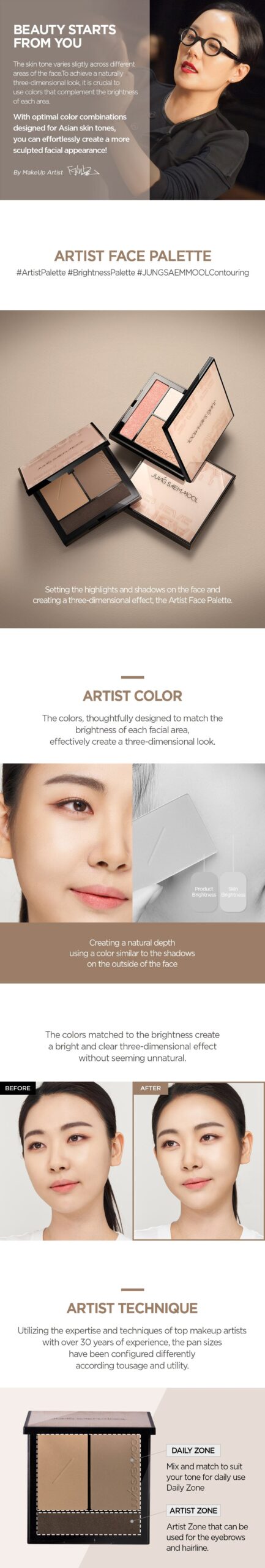 The JUNGSAEMMOOL Artist Face Palette #Contour is a professional-grade palette designed to create a natural, three-dimensional look. This palette is the culmination of over 30 years of expertise from top makeup artists.