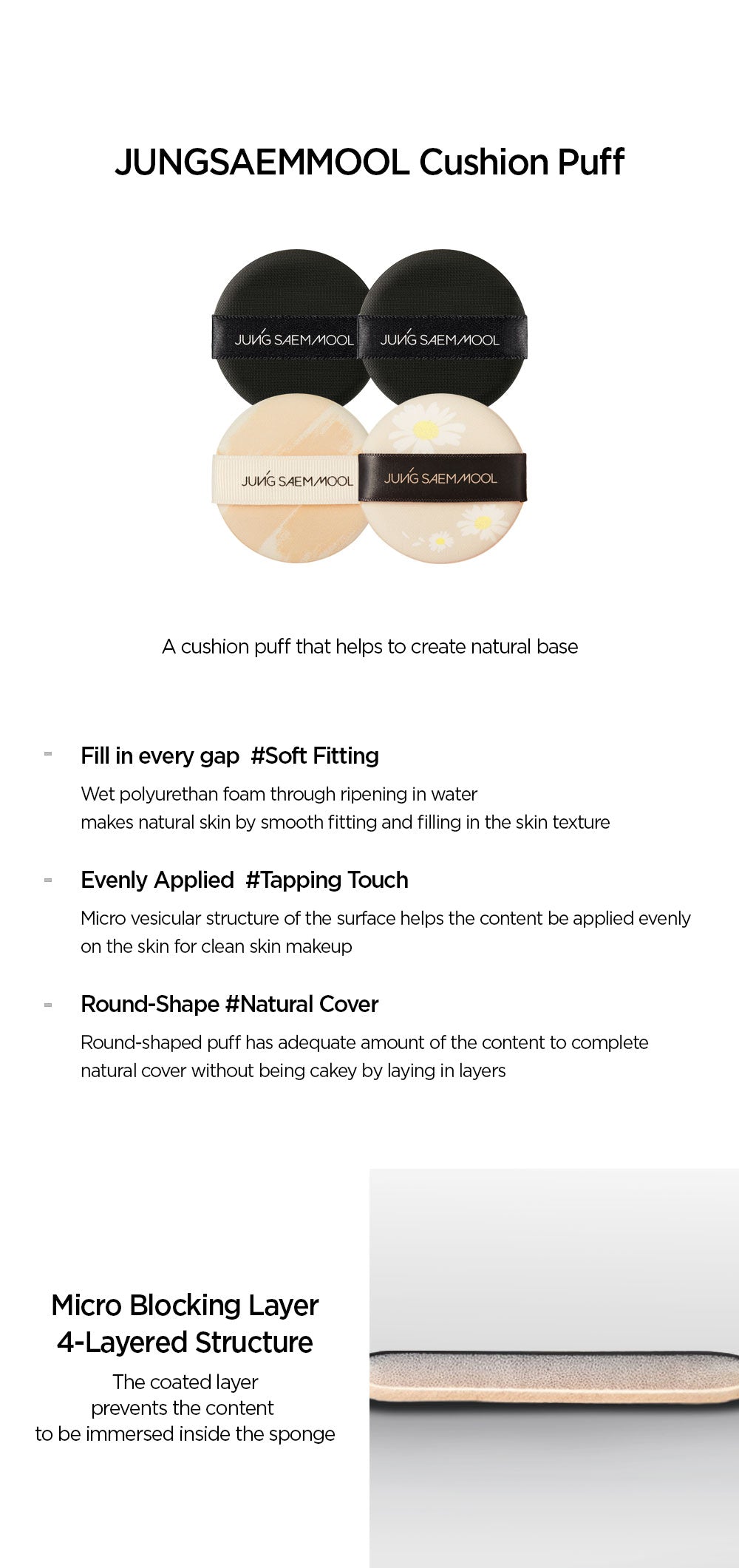 The cushion puff features a sophisticated 4-layered structure with a coated layer. This innovative design prevents makeup from being absorbed deep into the sponge, ensuring maximum product utilization and hygiene.
