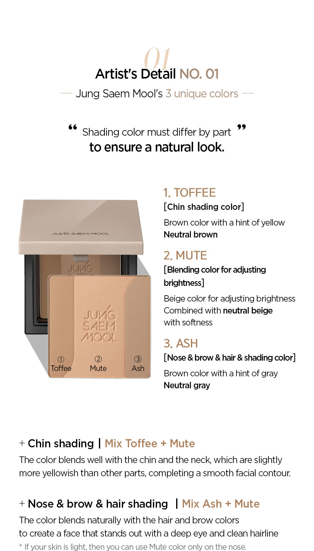 - Nose, Brow, and Hair Shading: Combine Ash and Mute for natural shading. Light-skinned individuals can use Mute alone for nose contouring.