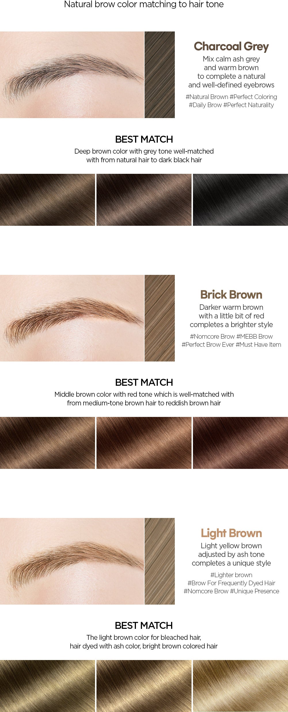 Match your natural brow color to your hair tone for the most natural effect: