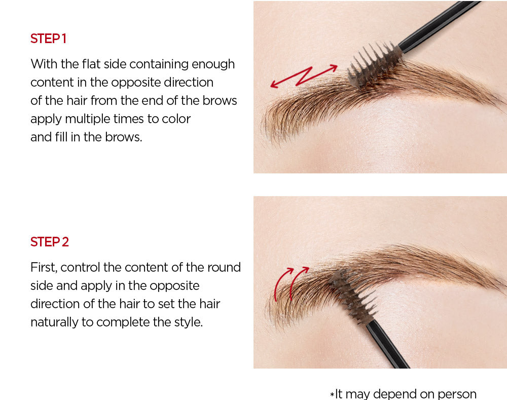 STEP 1: Use the flat side to apply the mascara in the opposite direction of hair growth, starting from the end of the brows. Repeat for thorough coloring. STEP 2: With the round side, lightly apply in the opposite direction of hair growth to set the brows naturally.