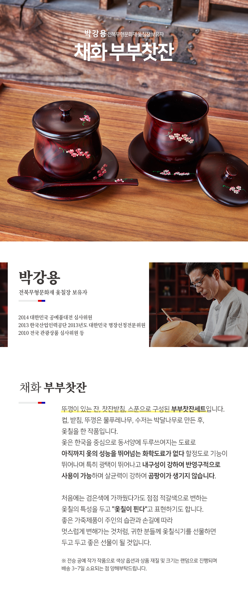 Experience the elegance of traditional Korea with this premium couple teacup set lovingly handcrafted by Jeonbuk Intangible Cultural Asset holder Park Kang-yong. This beautiful set, consisting of a covered teacup, saucer, and spoon, is intricately crafted using ash tree (spoon-Iron birch) and finished with traditional lacquer.