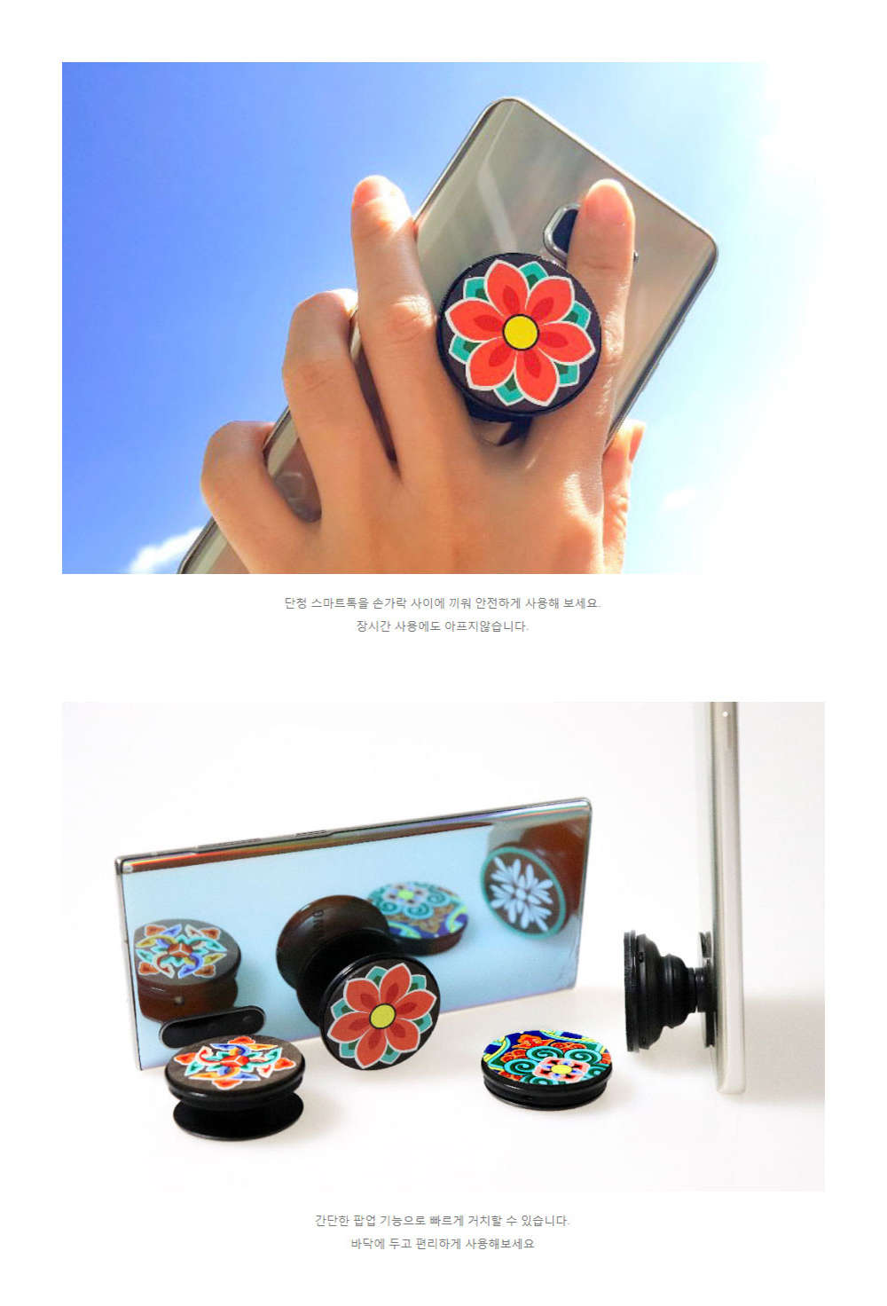 Designed to fit snugly between your fingers, the Dancheong Smart Talk offers a secure, ergonomic grip—making it easy to hold your phone for long periods without discomfort. Its compact structure pops up in two adjustable stages, allowing for flexible usage whether you’re texting, video chatting, or watching videos hands-free.