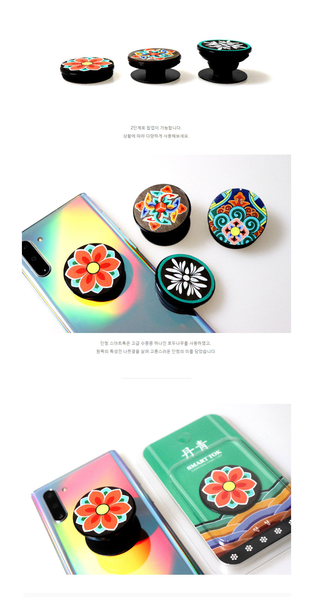 Dancheong, the vibrant decorative art of traditional Korean wooden architecture, features symbolic five-color patterns in blue, red, yellow, white, and black. These designs aren’t just visually stunning—they also help protect wooden surfaces from the elements over time. The Dancheong Smart Talk brings this centuries-old artistry into your everyday life with a smart grip that marries tradition and function.