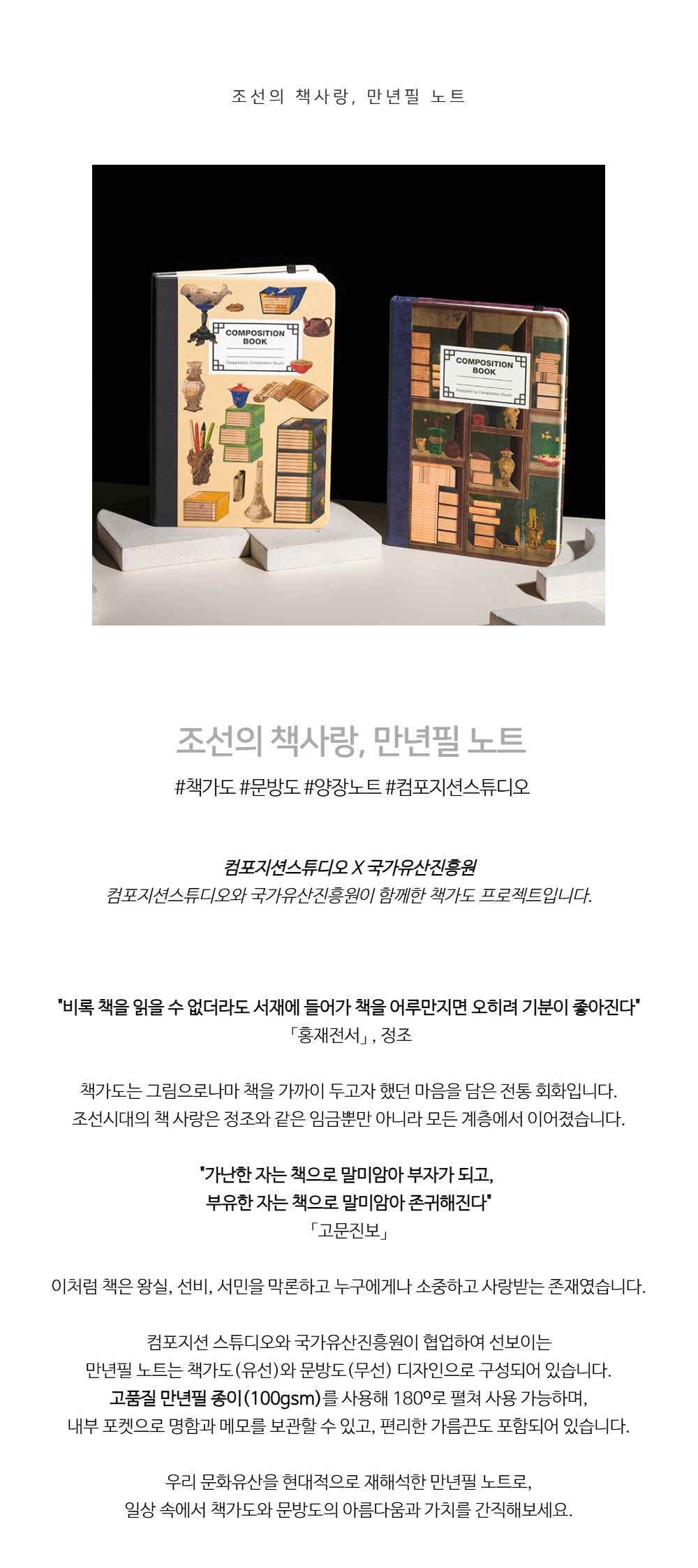 Explore a notebook that blends traditional Korean artistry with modern design. This elegant A5 fountain pen notebook is part of the Chaekgado Project, a collaboration between Composition Studio and the National Heritage Promotion Agency. Rooted in the rich cultural love of books from the Joseon Dynasty, this product captures the essence of Korea’s literary heritage in a contemporary form.