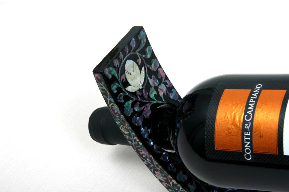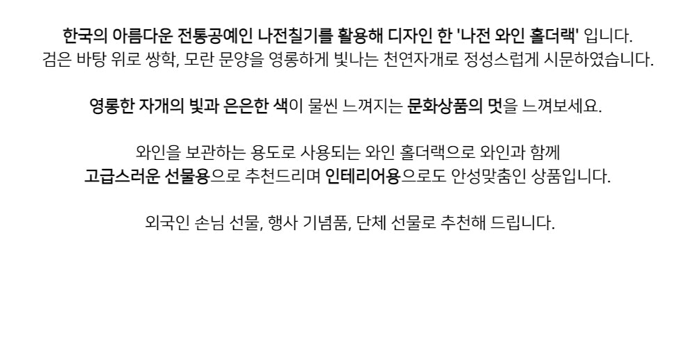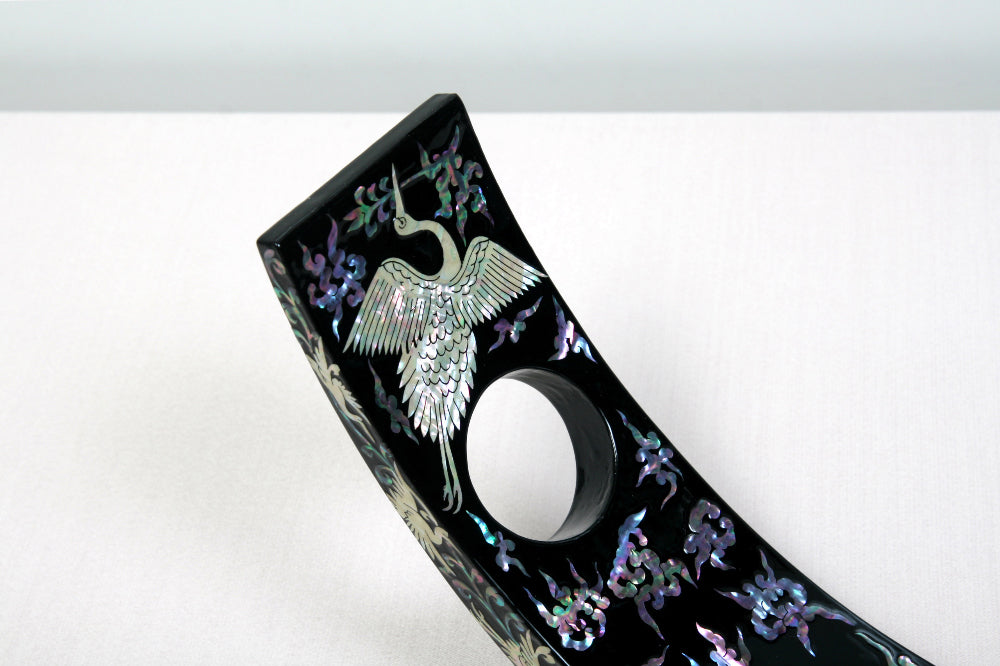 Introduce timeless elegance to your space with this exquisite Mother-of-Pearl Wine Holder Rack, intricately handcrafted using Korea’s traditional Najeonchilgi lacquerware technique. Showcasing a graceful motif of twin cranes and blooming peonies set against a deep black lacquered backdrop, this piece is a refined blend of art and function.