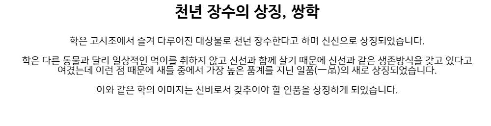 The crane, revered in Korean culture, symbolizes a thousand years of life and divine harmony. Known to live without daily sustenance, the crane is often associated with immortality and scholarly virtue—making it a powerful emblem of peace, wisdom, and elevated status. -