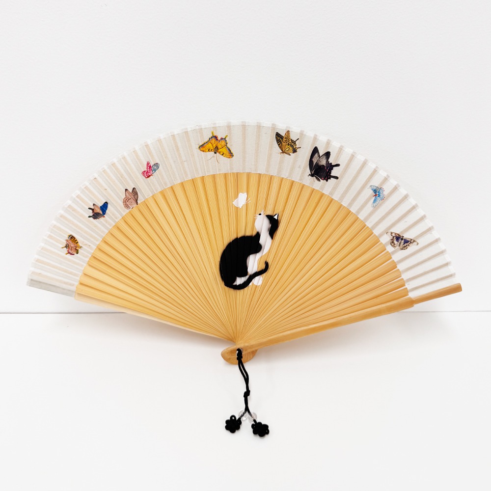 Inspired by painter Byeon Sang-byeok’s “Cat and Butterfly” (Myojakdo), the fan illustrates a cat sitting with its back turned, gazing at a fluttering butterfly. In the Joseon Dynasty, cats and butterflies together symbolized longevity and good health, often gifted as congratulatory presents for an 80th birthday.