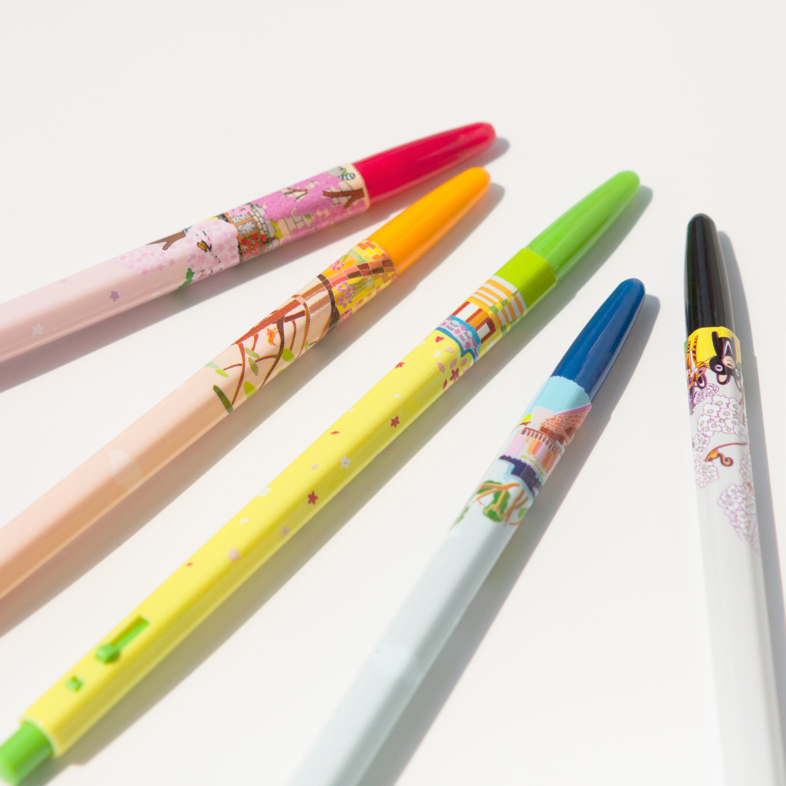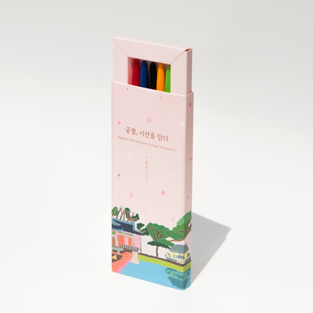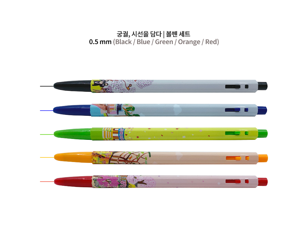 - Artistic Craftsmanship: A set of six vibrantly colored ballpoint pens, each adorned with distinct, charming illustrations inspired by the grandeur and subtle details of Korean palaces.